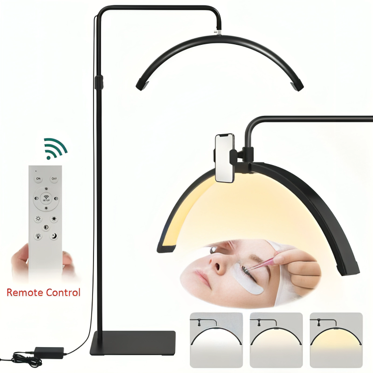 This versatile LED lamp offers bright, adjustable lighting, a stable floor stand and a phone holder + remote control, making it perfect for beauty salons, lash artists, and estheticians.